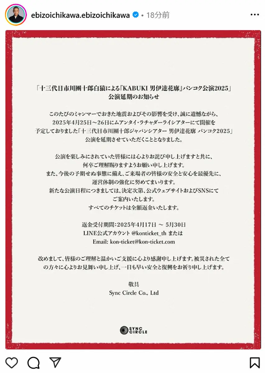 市川團十郎 Photo by スポニチ 市川團十郎 今月末開催予定だったタイ公演延期を報告「申し訳御座いませ… ギャラリーで見る この記事のフォト 2025年04月10日の画像一覧 もっと見る 2025年04月10日の画像をもっと見る
