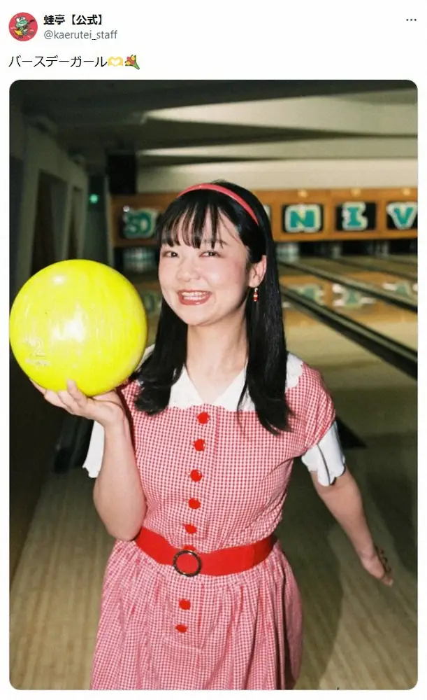 「バースデーガール」とのコメントと、ハートポーズと花束の絵文字を添えて投稿されたのはイワクラの画像。カチューシャを付け、赤いチェックのワンピース姿で、ボウリングの球を持つ写真が公開された。