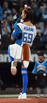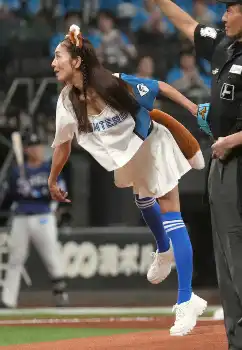 キツネと思われる耳と尻尾をつけたミニスカート姿で登場すると、大きく振りかぶった豪快なフォームで投球。惜しくもノーバウンドとはならなかったものの、2バウンドで捕手のミットに収まり、胸をなで下ろしながらホッとした様子でマウンドを降りた。