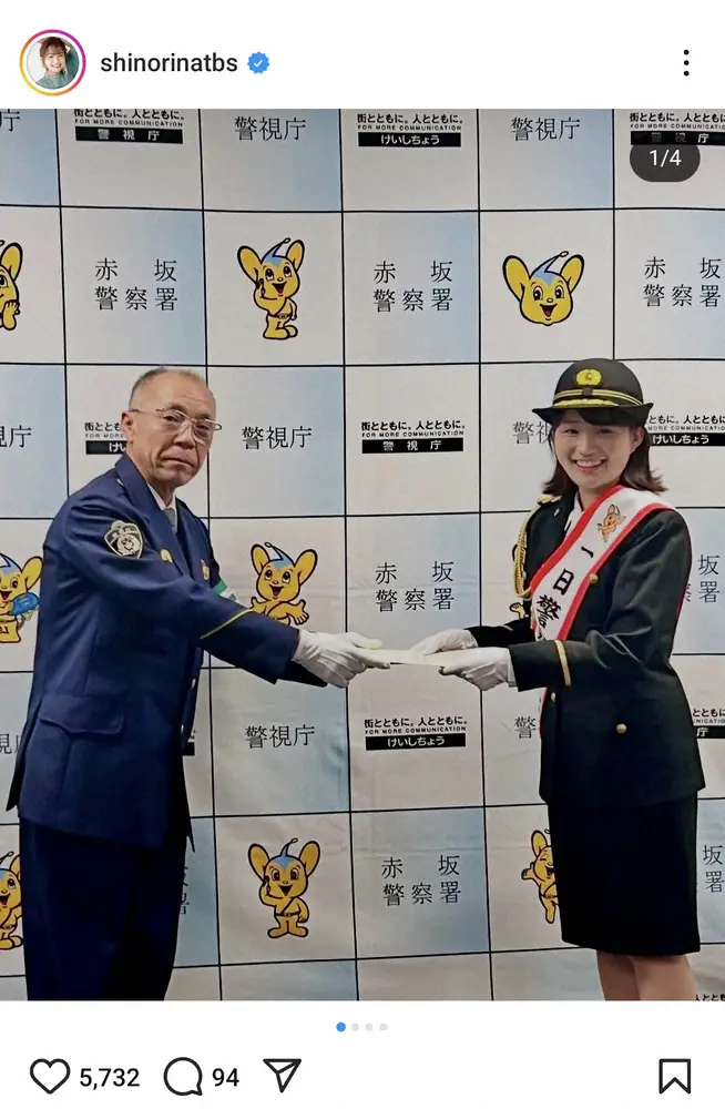 TBSの篠原梨菜アナウンサー(28)が13日、自身のインスタグラムを更新。一日警察署長の制服姿を披露した。