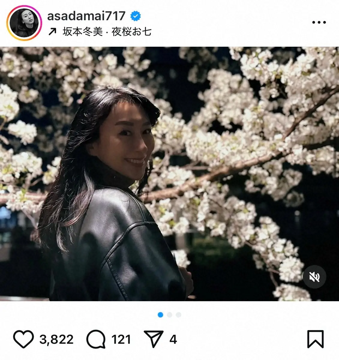 「夜桜お舞!」と添えられた投稿には、坂本冬美の「夜桜お七」をBGMに夜桜の前で振り返る自身の写真。