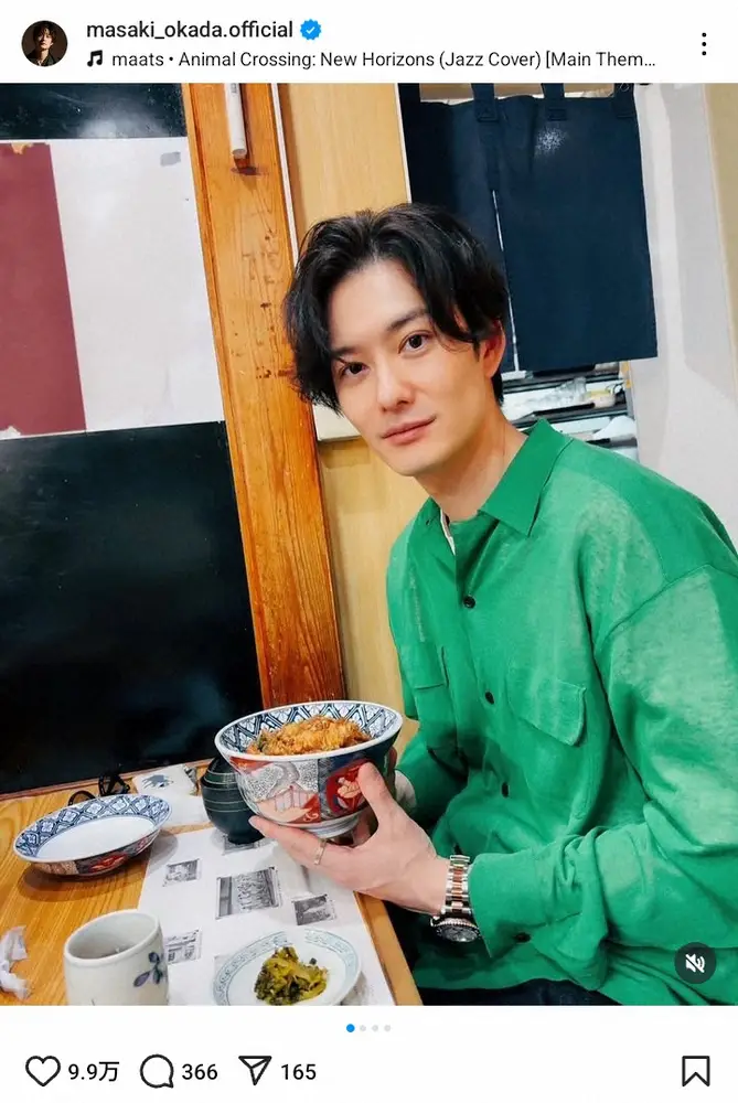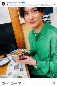 岡田は「わたくしは天丼が好きだ」とコメント。ハッシュタグで「ひさびさの」「好きだ」と添え、好物の天丼を前にしたグリーンのシャツ姿を披露した。