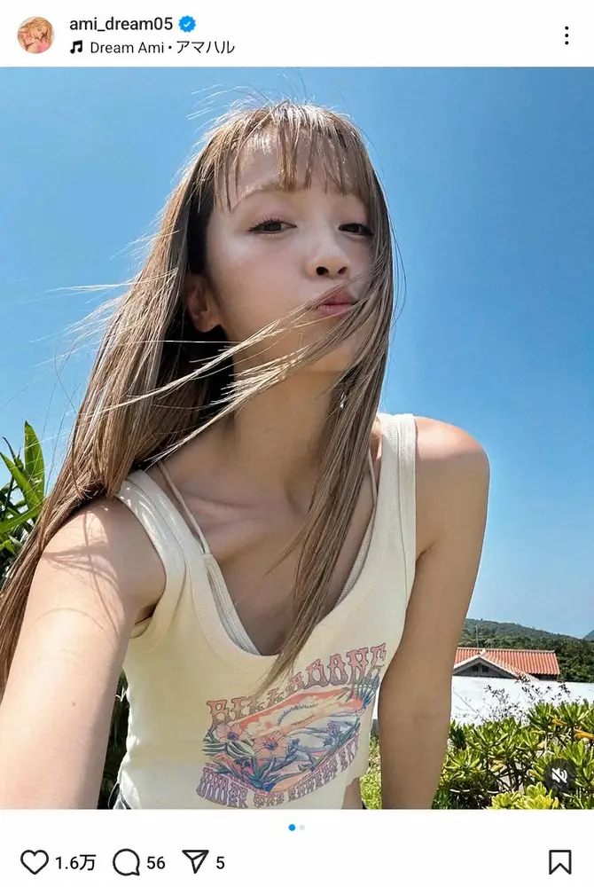 Amiは「髪の毛伸びたし 早くも焼けたし 桜は散ったね」とコメント。「夏が待ち遠しい!!」と、タンクトップ姿で髪をなびかせた自撮り写真を公開した。