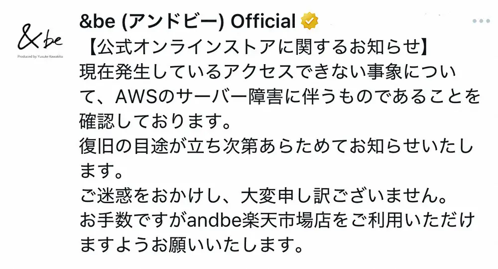 同ブランドは公式SNSを通じ「公式オンラインストアに関するお知らせ」を掲載。「現在発生しているアクセスできない事象について、AWSのサーバー障害に伴うものであることを確認しております」とし、「復旧の目途が立ち次第あらためてお知らせいたします。ご迷惑をおかけし、大変申し訳ございません」とした。
