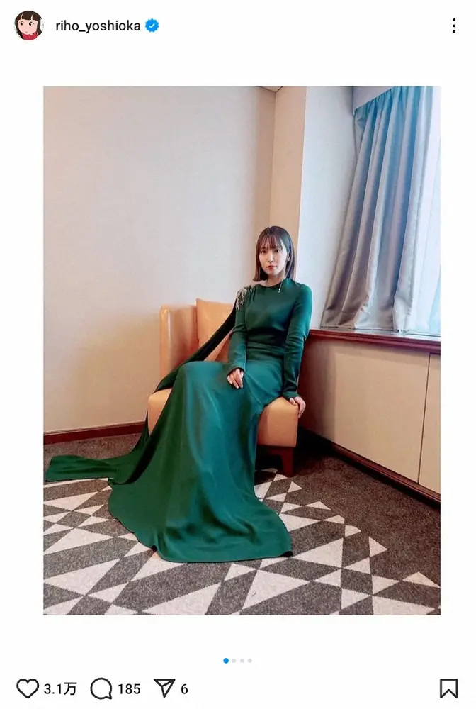 吉岡はハートやキスマーク、カバンなどの絵文字でコメント。濃い緑のロングドレス姿で椅子に座り、こちらを見つめる写真を公開した。