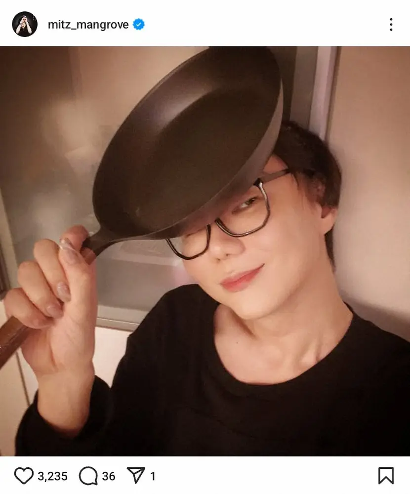 ミッツは「A perfect present from Nadja Grandiva for my birthday.(=私の誕生日にナジャ・グランディーバからの完璧なプレゼント)」とコメント。「Now I need to find something to fill in my empty fridge.(=さて、空っぽの冷蔵庫を埋めるものを探さなければ)」と、誕生日が同じタレントでドラァグクイーンのナジャ・グランディーバから贈られたフライパンとの"2ショット"写真を公開した。