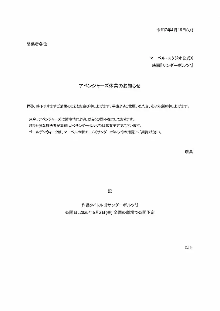 マーベル・スタジオ公式X(@MarvelStudios_J)から マーベル最新作「サンダー・ボルツ」 公式Xの投稿が話題「何事かと」「び… ギャラリーで見る この記事のフォト 2025年04月16日の画像一覧 もっと見る 2025年04月16日の画像をもっと見る
