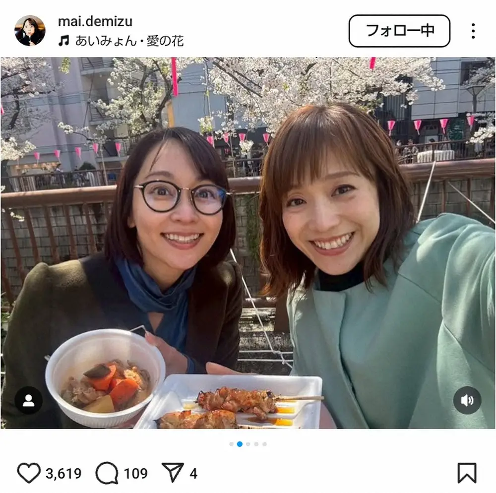 TBSの出水麻衣アナウンサー(41)が16日までに、自身のインスタグラムを更新。人気アナとの2ショット写真を披露した。
