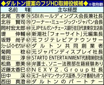 ダルトン社提案のフジ新取締役候補12人 企業統治に詳しい人物目立つ