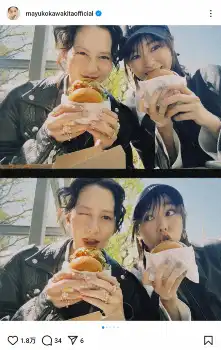 河北は「美玲とテラスでバーガーを食べてから展示会に行けて最高の1日だった~」と報告。ハッシュタグで「みれまゆ」と添え、親友の桐谷美玲とハンバーガーを手にした写真や、展示会での全身ショットを公開した。