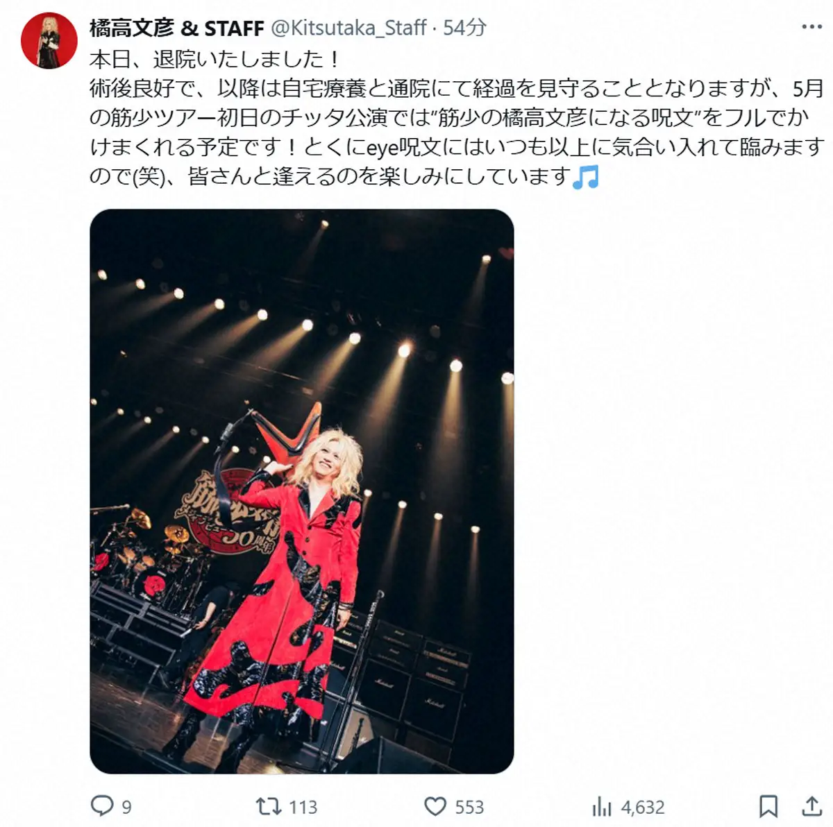 橘高は「本日、退院いたしました!」と報告。「術後良好で、以降は自宅療養と通院にて経過を見守ることとなりますが、5月の筋少ツアー初日のチッタ公演では“筋少の橘高文彦になる呪文”をフルでかけまくれる予定です!とくにeye呪文にはいつも以上に気合い入れて臨みますので(笑)、皆さんと逢えるのを楽しみにしています」と術後良好とし、次のツアーに向けて意気込みをつづった。