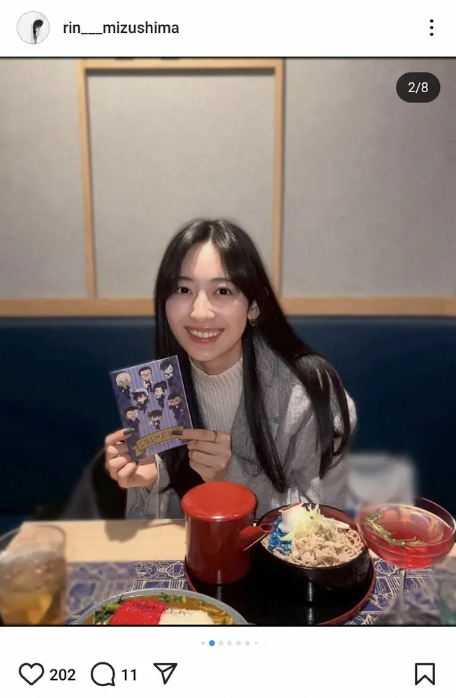 「こんなにコナン好きなのによく考えたら一度もコラボカフェに行ったことがない、なんならコラボカフェというものに行ったことがないことに気づいて、行ってきました」とし、「もー楽しくて楽しくて全てのメニューを頼みたかったですが我慢して、憧れのアポトキシン4869カレーとコナンくんモチーフの青いお蕎麦を頂きました。歯は言うまでもなく真っ青になりました!!」と回顧。