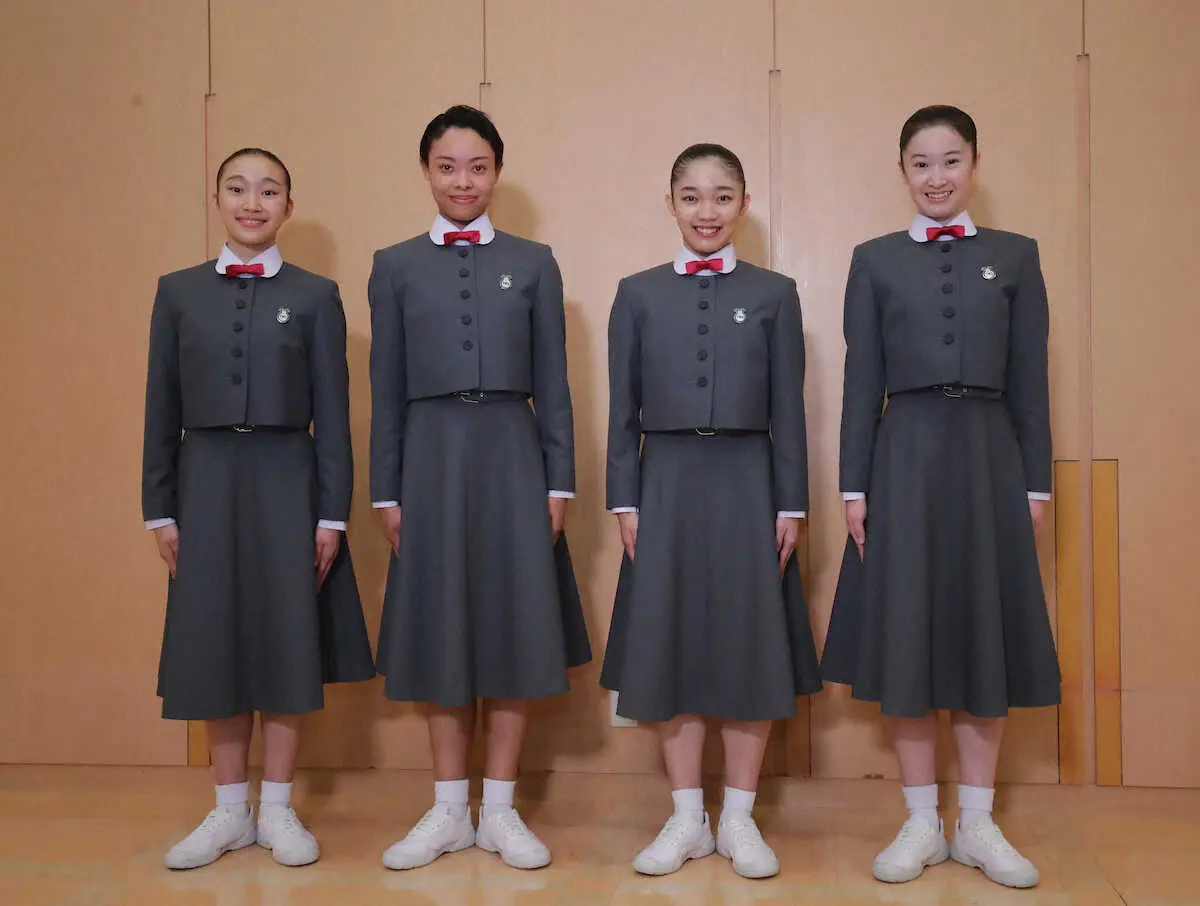 <宝塚音楽学校・入学式> 囲み取材を終え、記念撮影する(左から)佐藤桜耶さん、青木さらさん、松崎瑠璃さん、長谷川佳凜さん (撮影・後藤 大輝)