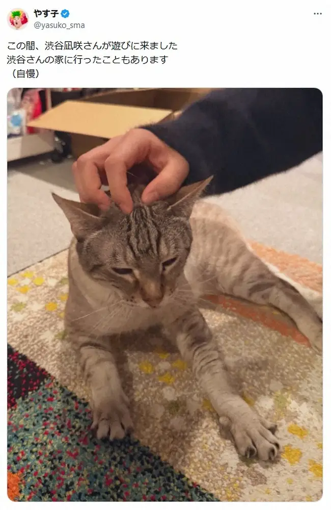やす子は「この間、渋谷凪咲さんが遊びに来ました」と報告。「渋谷さんの家に行ったこともあります(自慢)」と、愛猫「アビシ」をなでる手の写真を公開した。