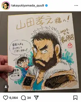 「2025.4.18 劇場版『名探偵コナン隻眼の残像』(上の吹き出しはコナン君ですが、下の吹き出しは私が演じた大友隆の言葉です。念の為真実は隠しました)」とつづり投稿したのは、原作者・青山剛昌氏が、山田が声優を務めたキャラクター・大友隆を描いた色紙。