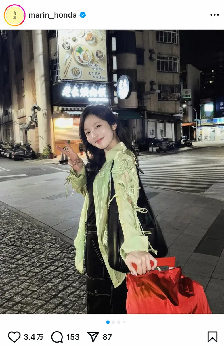 本田さんは「ずっと楽しみにしていたとあるお仕事で台湾へ」と書き出し、台湾の街並みをバックにピースする写真をアップ。キャリーバックを手にポーズを取る全身ショットも披露し「超超楽しみにしていてくださいなっ!!!」と呼びかけた。