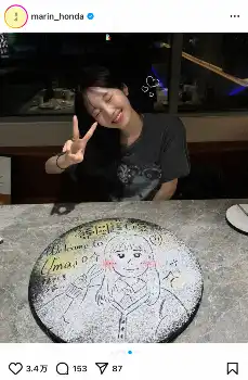 また、自身の似顔絵が描かれたプレートを前に笑顔のショットも公開。「#まりんのふく」と紹介しているハッシュタグについても「この私服紹介タグ地味に続いてるの気づいてる?」とつづった。
