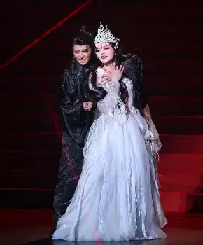 礼は退廃的な雰囲気をまとう男の色気を醸し、クライマックスで見せる圧巻の立ち回り、その中で聞かせる歌声で客席を魅了。次期トップながら女役で魅せた暁は圧倒的な美しさで劇場の空気を支配した。次期トップ娘役の詩ちづる(うた・ちづる)はコミカルな役どころで躍動し、同公演を最後に花組への組替えが決まっている極美慎(きわみ・しん)は敵役として存在感を示した。