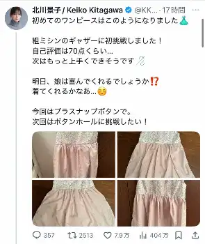 女優の北川景子(38)が20日までに自身のXを更新。手作りのワンピースが反響を呼んでいる。