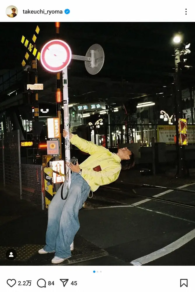 竹内はハッシュタグで「竹内写真部」と添え、「部活動の報告」とコメント。「『新しい思考はポジティブにすぐに取り入れるべき。仲間は大切。』」と紹介し、踏切前の道路標識につかまってのけぞるポーズや、歩道橋でカメラを構える姿を公開した。