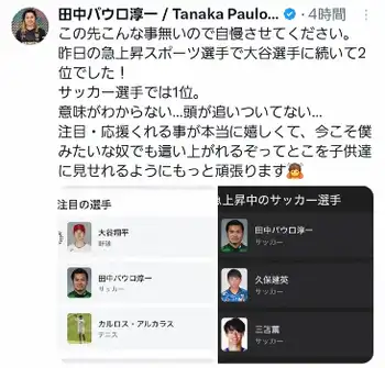 J3栃木CのFW田中パウロ淳一(31)が22日、自身のX(旧ツイッター)を更新。前日21日の「急上昇スポーツ選手」ランキングで大谷翔平に次ぐ2位だったことを明かした。