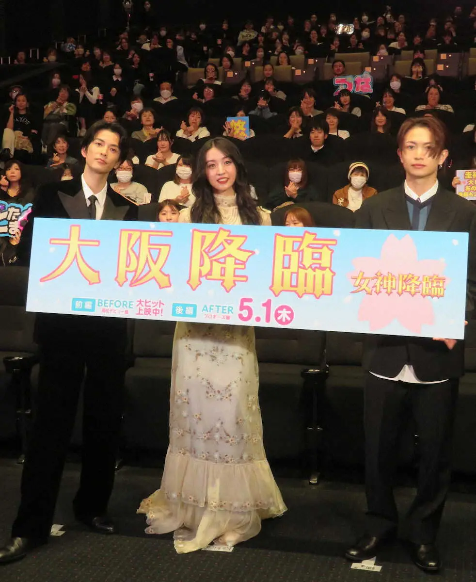 モデルで女優のKoki,(22)が22日、大阪市内で主演映画「女神降臨 Before 高校デビュー編」(監督星野和成)の公開御礼舞台あいさつを共演の渡邊圭祐(31)、綱啓永(26)とともに行った。