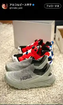 平子は「息子の足が28cmに。もうパパまであと2cm」とつづり、2足のスニーカーの写真を投稿した。