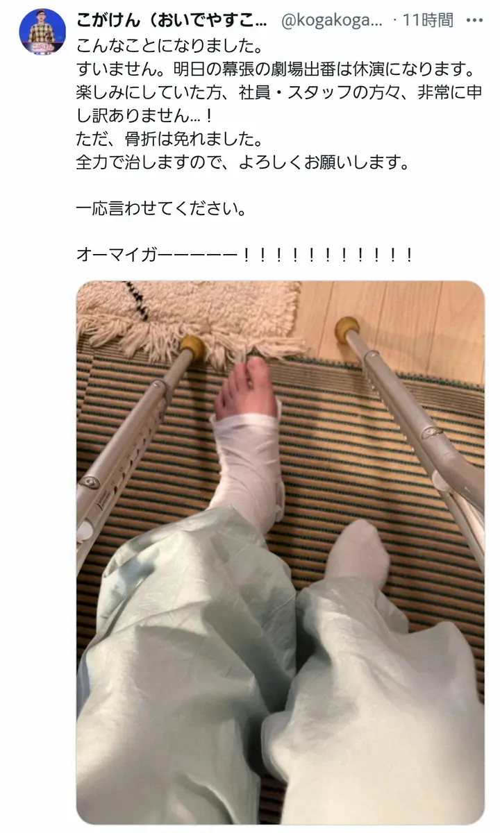 こがけんは「こんなことになりました」と書き出し、左足にギプスと包帯を巻き松葉杖をつく写真をアップ。「すいません。明日の幕張の劇場出番は休演になります」と報告し、「楽しみにしていた方、社員・スタッフの方々、非常に申し訳ありません…!」とつづった。