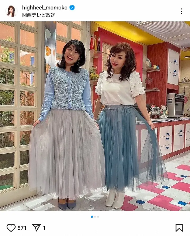 モモコは「またまた『モモコのOH!ソレ!み~よ!』の時の衣装が中島アナとお揃いみたいになりました」と告白。同番組でアシスタントを務めるカンテレ・中島めぐみアナウンサーとの2ショット写真を公開した。