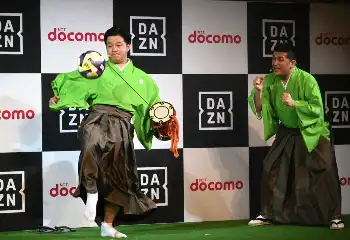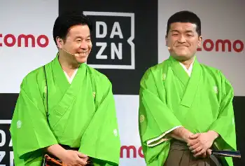 お笑いコンビ「すゑひろがりず」南條庄助(42)、三島達矢(42)、元日本ハムでタレントの杉谷拳士(34)、サッカー元日本代表の槙野智章氏(37)が24日、都内で行われた「NTTドコモ×DAZNパートナーシップ契約締結発表会」に出席。リフティング対決で会場を盛り上げた。