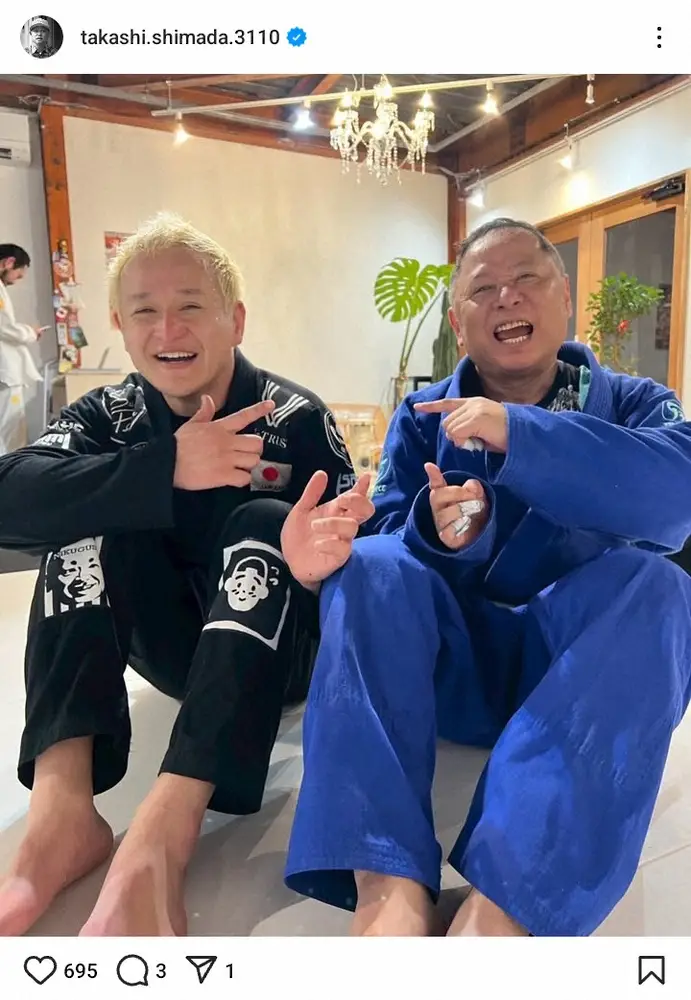 嶋田氏は、自身が通うブラジリアン柔術の道場に「ワールドマスター世界選手権優勝、ヨーロッパ柔術選手権優勝の無双男 ガリットチュウ福島善成さんが出稽古に来てくれました」と、福島との2ショット写真を公開した。