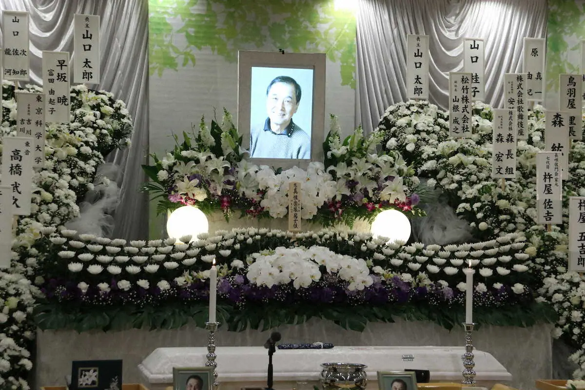 祭壇は笑顔の山口さんの遺影を中心に白い花で囲まれた。棺には好きだった三味線の譜面や手元に置いて読み返していた代表作のNHK時代劇「天下御免」の本が納められたという。式場には石井ふく子さん、尾上菊五郎、中村勘九郎、中村七之助らからの供花が並んだ。喪主を務めた長男の太郎さんは「にぎやかなことが好きな父だったので、今頃(天国で)どんちゃん騒ぎをしているのではないでしょうか」としのんだ。戒名は「真雅崇鳳居士」。