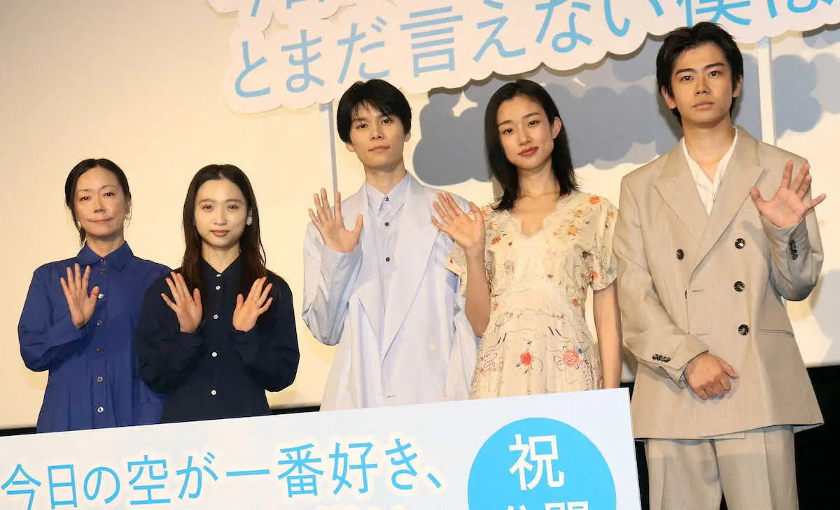 映画「今日の空が一番好き、とまだ言えない僕は」の公開記念舞台あいさつに出席した(左から)大九明子監督、伊東蒼、萩原利久、河合優実、黒崎煌代