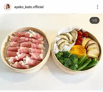 加藤は「最近蒸篭にハマってます」とつづり、せいろに美しく入れられたエノキタケの肉巻きや、餃子、ミニトマト、ブロッコリー、カボチャなどの野菜類の写真を投稿。