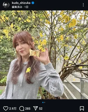 歌手の工藤静香(54)が28日までに自身のインスタグラムを更新。レンギョウの花をバックにパイナップルケーキ“パクッ”ショットをアップした。