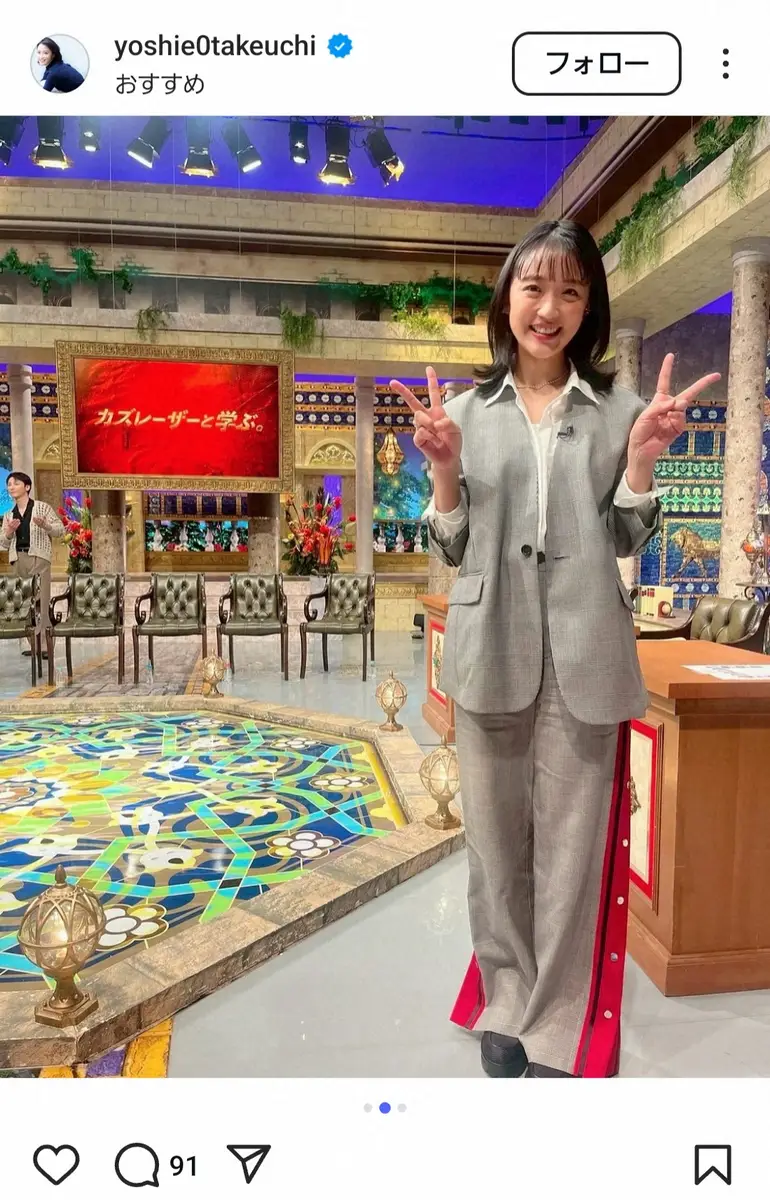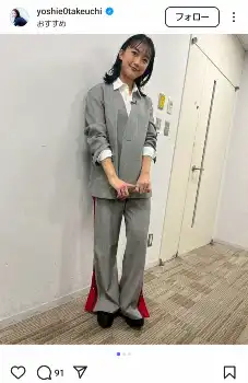 竹内は「明日放送の『カズレーザーと学ぶ。』に出演しています。今回のテーマは「あなたの命と時間を守る!目からウロコの交通新知識」です。GWでお出かけする前に要チェックです」と出演番組を告知し、グレースーツのセットアップを身に舞った全身ショットを披露。