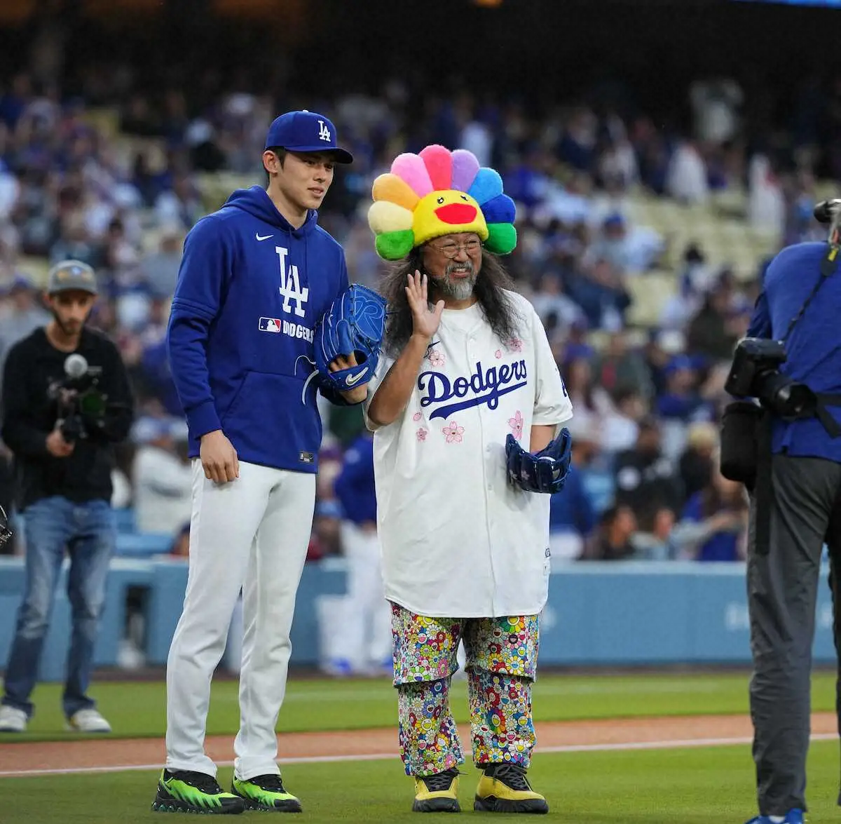 <ドジャース・マーリンズ>始球式で捕手役を務めたドジャース・佐々木(左)は村上隆氏と笑顔で記念撮影(撮影・沢田 明徳)
