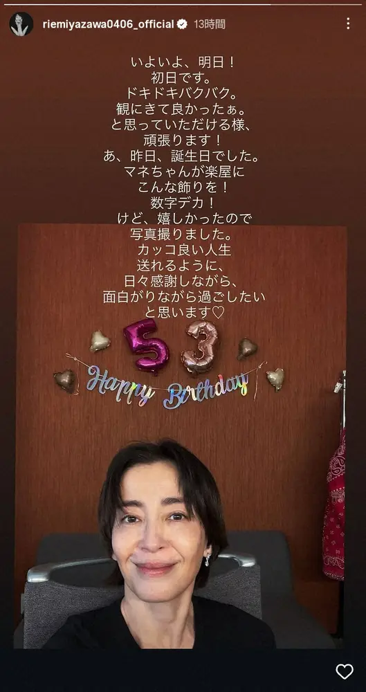 宮沢は「ゴールデンなウィークいかがお過ごしですか?」と呼びかけ、「『昭和から騒ぎ』私は絶賛お稽古中です。喜劇です。人間というのは、とても不思議な生物だなぁと、感じます」と告白。「生きてます」と続けた。