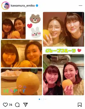 川村は「相武紗季さんと!ごはん」と書き出し、女優の相武紗季との2ショットをアップ。相武が手にしたグレープフルーツは川村からのプレゼントだといい「コイルの理論の話とコン・ユさんの話でややこしくて楽しかったです」と盛り上がったことを明かした。
