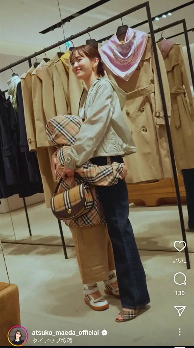 前田は「バーバリーチルドレンにはかわいい子供服がたくさんあり親子お揃いコーディネートをしてみました お気に入りはお揃いトレンチコート あとはチェックのセットアップ可愛かった」とつづり、バーバリーのショップで母子でコーディネートを楽しむ動画を投稿。