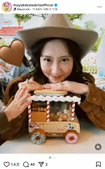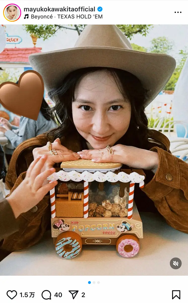 同日の投稿で、東京ディズニーランドを訪れたことを明かしていた河北。今回は「ずっと欲しかったポップコーンバケットもゲット」とつづり、ミッキーやミニーがプリントされたポップコーンバケットを手に、上目遣いでカメラを見つめる写真を公開した。