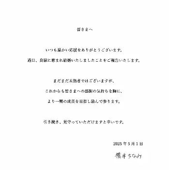 直筆署名入りの文書を投稿し、「皆さまへ いつも温かい応援をありがとうございます。過日、良縁に恵まれ結婚いたしましたことをご報告いたします」と結婚したことを報告した。