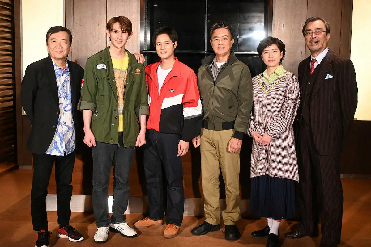 笑顔を見せる(左から)鴻上尚史氏、大内リオン、岡本圭人、石黒賢、南沢奈央、益岡徹(撮影・井利 萌弥)