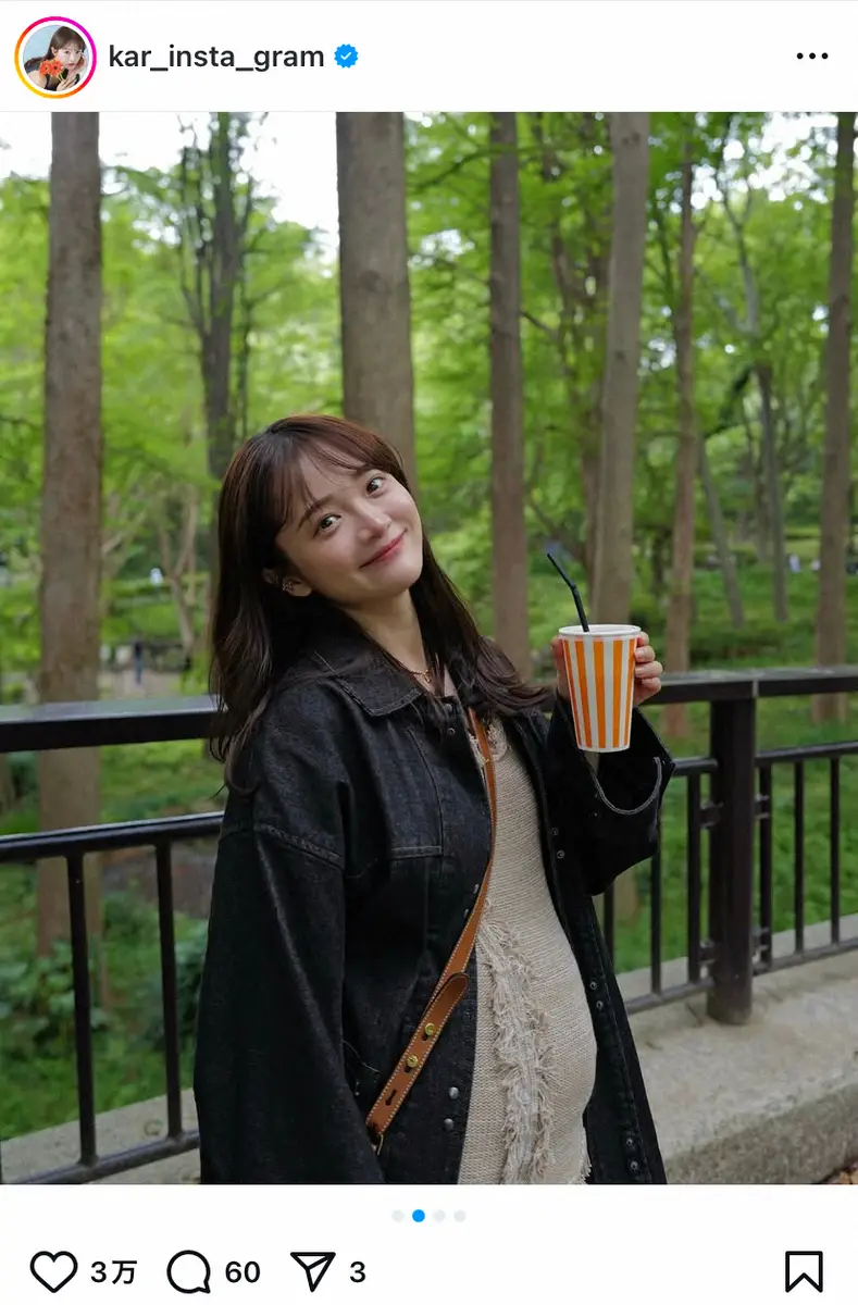 この投稿に、フォロワーからは「マタニティーライフ楽しんで」「おなかおっきいー!」「こんなに大きかったのね」「もうお母さんの顔つきになっててさらに柔らかい雰囲気になりましたね」「そんなに大きくなってたなんて」「本当に素敵な家族写真」「かわいすぎる妊婦さん」などの声が寄せられている。