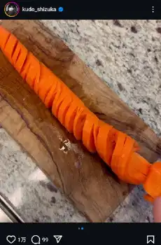 「そして、2枚目本当はきゅうりでやるととても伸びます。もうきゅうりは食べてしまったので。笑 この切り方をして酢漬けにすると、歯触りが良いですし、味もしっかり入ります。片面を細かく縦に切ります、半分以上切り目を入れて大丈夫です。そしてもう反面を斜めに細かく切りめを入れます!初めてやる方は、にんじんはやらないほうがいいです。ぜひ、きゅうりから!」と酢漬け野菜のカットの仕方も動画で紹介。