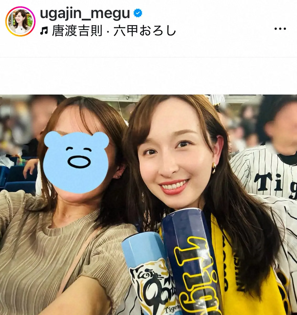 TBSの宇賀神メグアナウンサー(29)が8日、自身のインスタグラムを更新。プロ野球観戦ショットを披露した。
