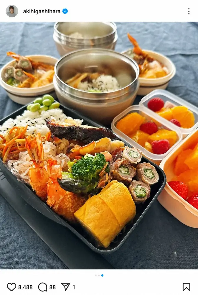 この投稿を受けて「画面みた瞬間タキマキさんのインスタだと思ったらあきちゃんだった!こんなお弁当幸せ過ぎる~」「私もタキマキさんだと思いました」と、料理上手としても知られるモデル・滝沢眞規子の名前を挙げるファンも。他に「すごい!豪華すぎる!!」「もはや尊敬」「美味しそう」「凄い。凄すぎる」「品数さすがです!!」などの声が集まった。