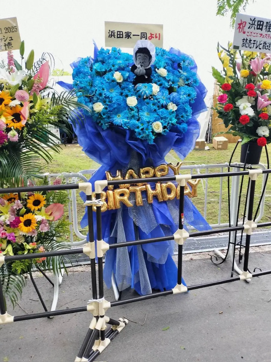 会場には、各所から届いたフェス開催を祝うスタンド花が並べられた。 その中には、ひときわ目立つブルーの花でハートがかたどられた花束風の盛花が。「浜田家一同より」と書かれた札とともに浜田のユーモラスなぬいぐるみ、さらに金色のバルーン文字「HAPPY BIRTHDAY」が装飾されている。