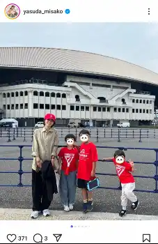 安田は「昨日は、家族とお友達のお子さんを預かって、バスケの応援に行きました。 千葉ジェッツ! めっちゃ盛り上がる激しい試合で。。 スターだらけの。。子供達も大興奮!!な時間になりました。 富樫くんの連続シュートが決まるのも神がかっていたし。。。」とつづり、ベージュシャツに黒のパンツ、千葉ジェッツカラーである赤の帽子を合わせたラフコーデに、子供たちは千葉ジェッツの公式Tシャツを身につけた応援スタイルでの4ショットを投稿した。