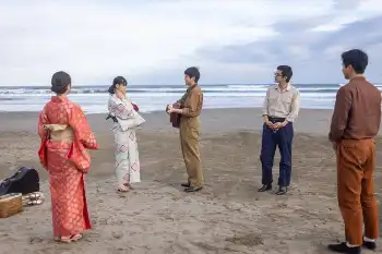 海から帰る5人。波打ち際を歩きながら、メイコは「仲直りできて、よかったですね」。健太郎の「メイコちゃんのおかげやね」に再び驚き、駆け出すと転んでしまう。健太郎が差し出した手につかまり、立ち上がった。